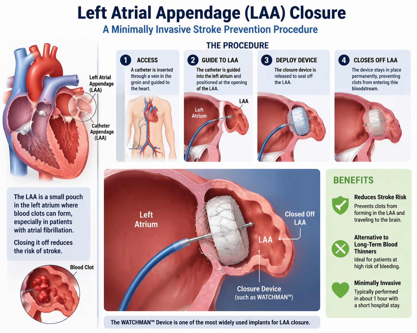 For patients with atrial fibrillation (AFib), the left atrial appendage can be a source of blood clots, which can lead to a stroke. The procedure known as Left Atrial Appendage Closure (LAAC) is designed to close off this part of the heart, significantly reducing the risk of stroke in AFib patients.